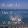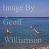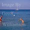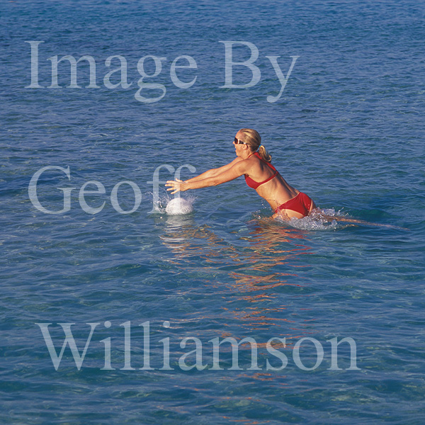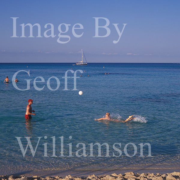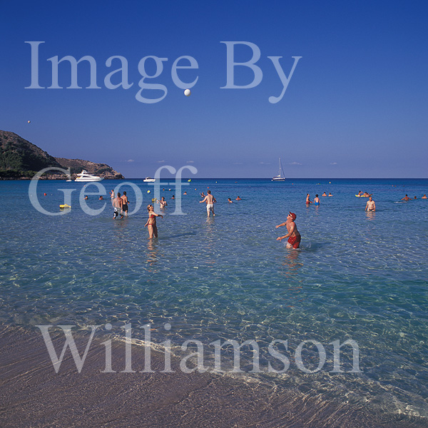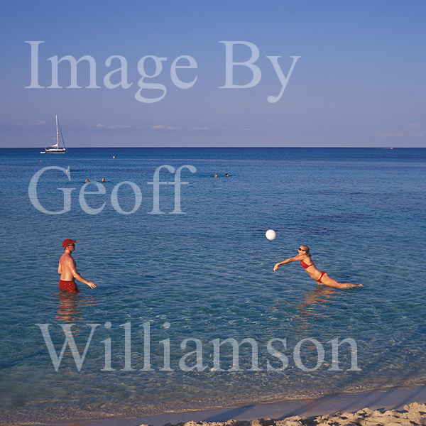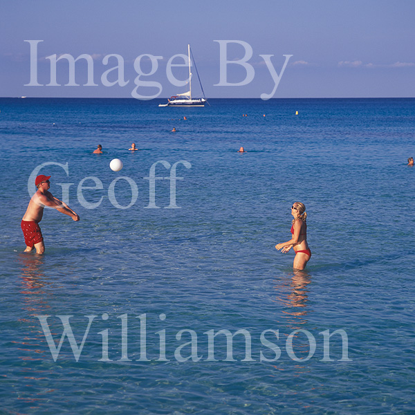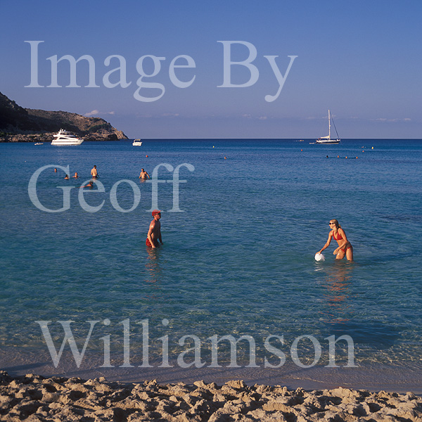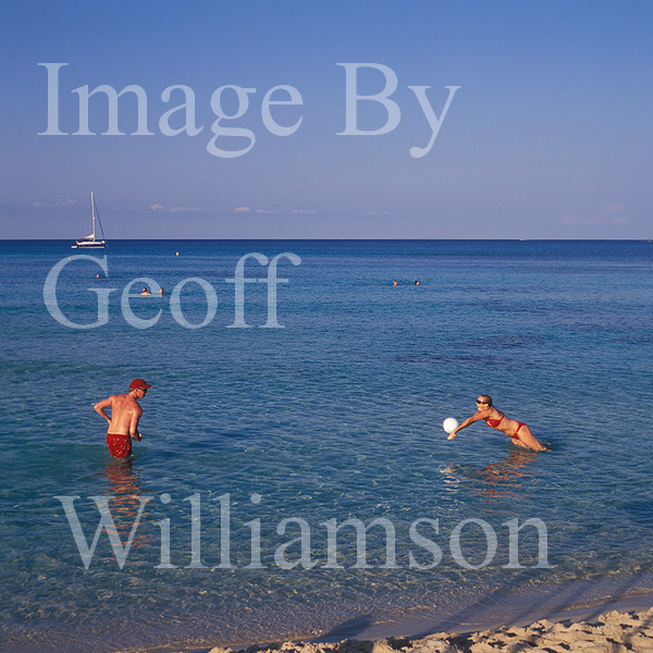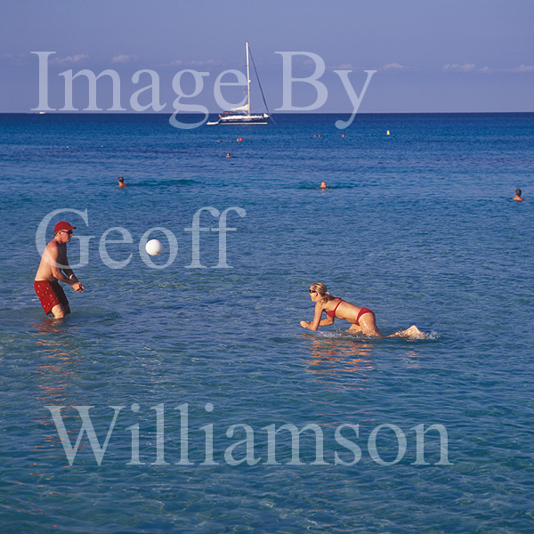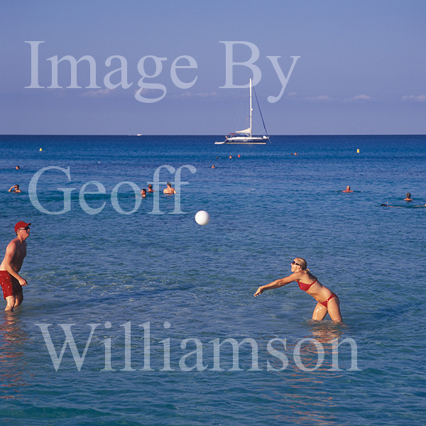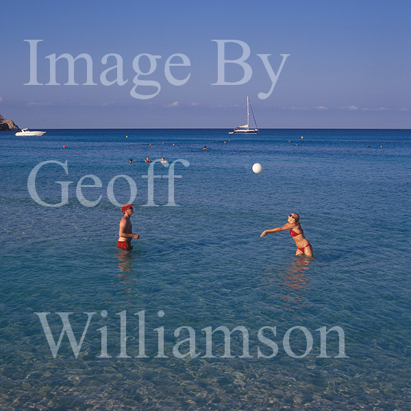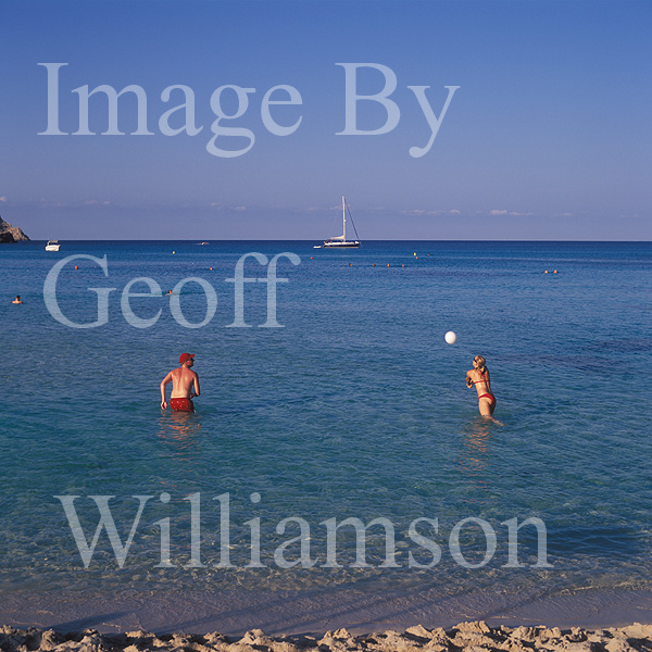 Scene at Cala Agulla - young couple playing volleyball in the sea - idyllic sandy bay close to Cala Ratjada, North East Mallorca, Balearic Islands, Spain. 9th September 2007. Verbal Model Release.