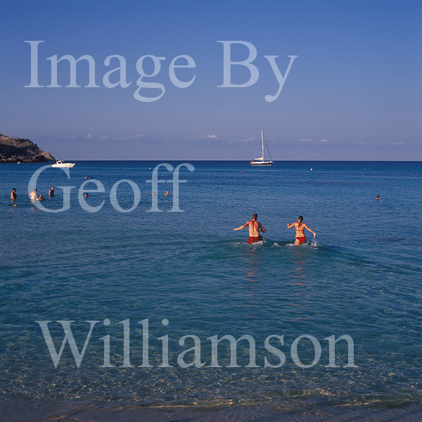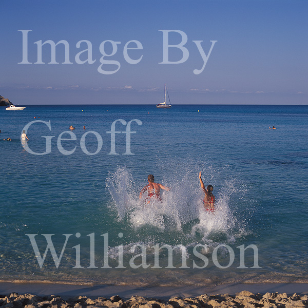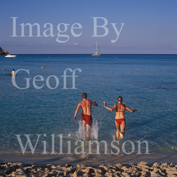 Scene at Cala Agulla - young couple running into the sea - idyllic sandy bay close to Cala Ratjada, North East Mallorca, Balearic Islands, Spain. 9th September 2007. Verbal Model Release.