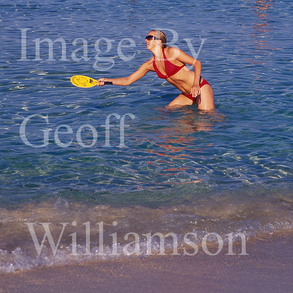 Scene at Cala Agulla - young couple playing padder tennis in the sea - idyllic sandy bay close to Cala Ratjada, North East Mallorca, Balearic Islands, Spain. 9th September 2007. Verbal Model Release.