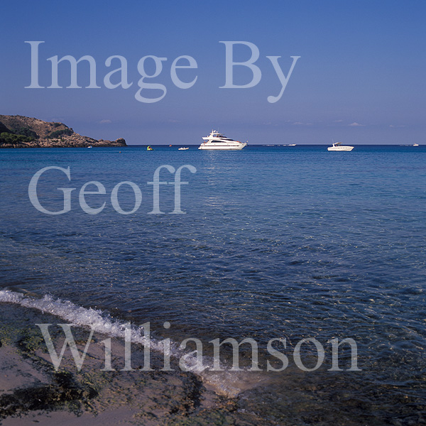 Scene at Cala Agulla - idyllic sandy bay close to Cala Ratjada with luxury motor yachts at anchor, North East Mallorca, Balearic Islands, Spain. 9th September 2007.