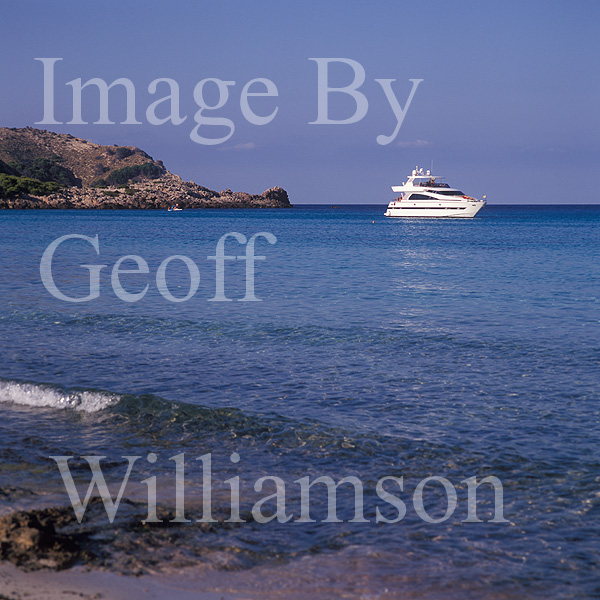 Scene at Cala Agulla - idyllic sandy bay close to Cala Ratjada with luxury motor yacht at anchor, North East Mallorca, Balearic Islands, Spain. 9th September 2007.