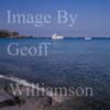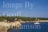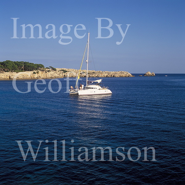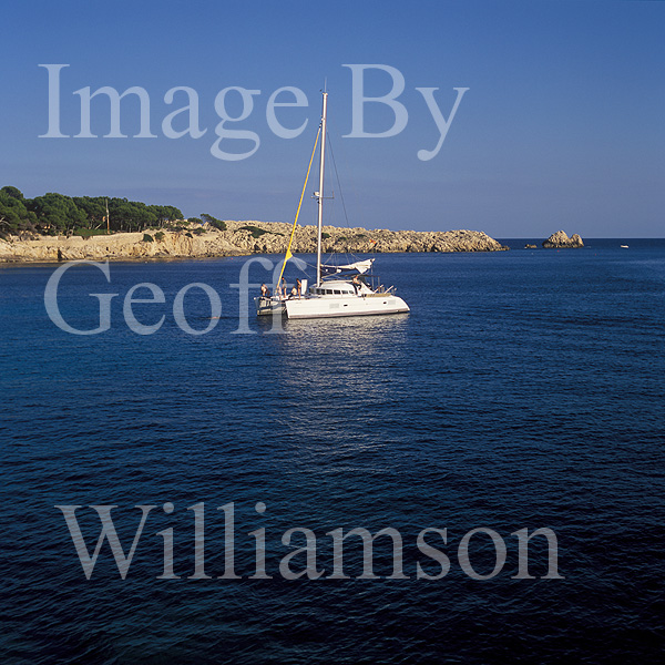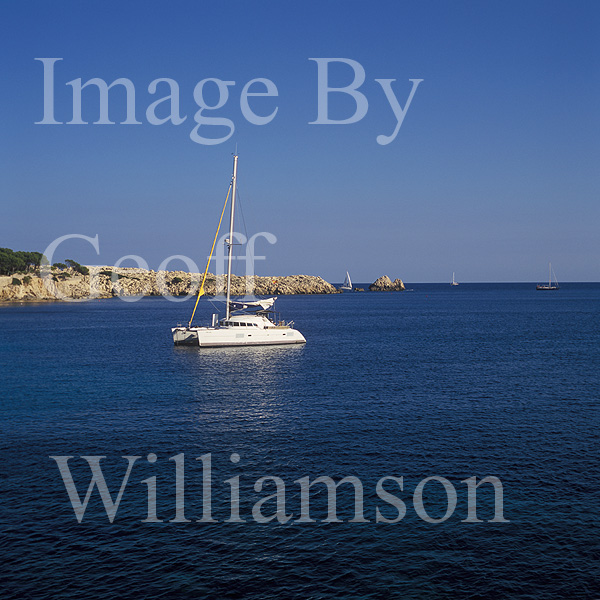 Cala Rajada ( Ratjada ) scene - coastline North of Cala Rajada / Ratjada harbour with anchored catamaran sailing yacht - North East Mallorca, Balearic Islands, Spain. 7th October 2007.