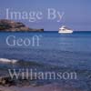 Cala Rajada ( Ratjada ) scene - coastline North of Cala Rajada / Ratjada harbour with anchored catamaran sailing yacht and Faro / Lighthouse / de Capdepera - North East Mallorca, Balearic Islands, Spain. 7th October 2007.