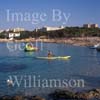 Scene at Cala Agulla - idyllic sandy bay close to Cala Ratjada with canoe and fun boat returning to shore, North East Mallorca, Balearic Islands, Spain. 9th September 2007.