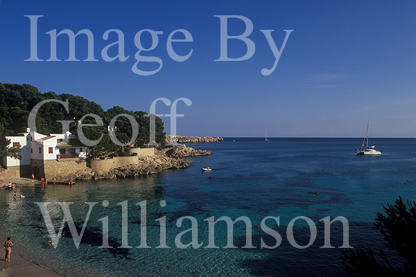 Cala Rajada ( Ratjada ) scene - small popular cala/bay with swimmers and anchored catamaran sailing yacht - North of Cala Rajada / Ratjada harbour - North East Mallorca, Balearic Islands, Spain. 7th October 2007.