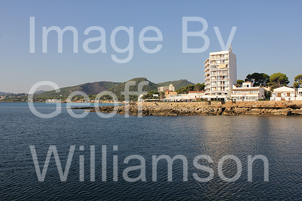 Cala Ratjada / Cala Rajada - leaving port heading South - promenade + coastal hills - North East Mallorca / Majorca, Balearic Islands, Spain. 5th October 2011.