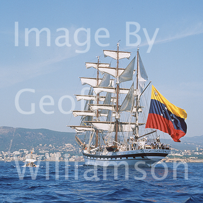 Superyacht, SW mallorca. Tall Ship Simon Bolivar south of Mallorca. Puerto Portals, SW Mallorca. Royal sailing yacht "Bribon" in Kings Cup Regatta. US Naval support vessel in Palma bay.