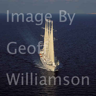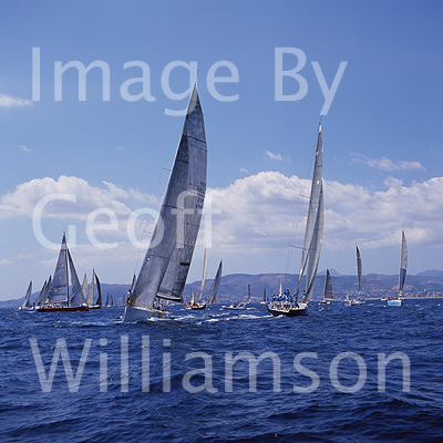 Club de Mar, Mallorca. Royal sailing yacht "Bribon" in Copa Del Rey, Palma de Mallorca. Sail Cruise ship "Wind Star" sailing south from Ibiza. Superyacht in SW Mallorca. Tall Ship "Palinaura" sailing south of Mallorca,