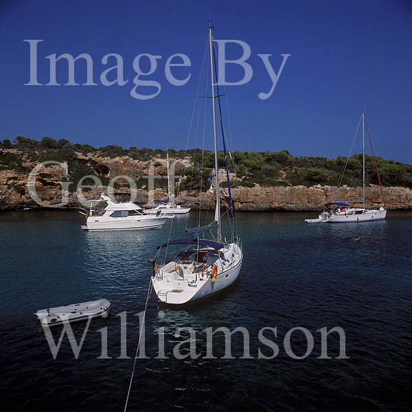 View in Cala Sa Nau ( sailing boats / leisure craft ) South of Portocolom, SE. Mallorca, Balearic Islands, Spain. 21st September 2004.