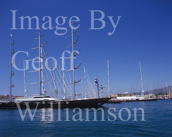 Superyacht Cup Palma 2007 - early morning view of Regatta village with Maltese Falcon Super Sailing Yacht ( 88 metres long designed by Dijkstra and built in Perini Navi yard ) dominating the forrest of masts in the Port of Palma de Mallorca, Balearic Islands, Spain. 17th June 2007.