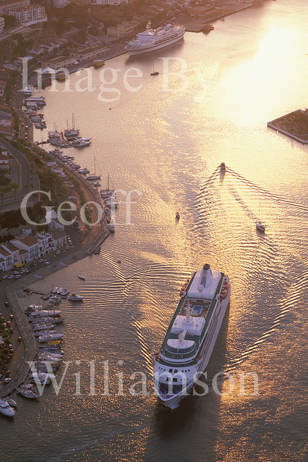 Aerial View of cruise liner "WIND SPIRIT" departing Mao (formerly Mahon), Menorca / Minorca, Baleares, Spain. 1998.
